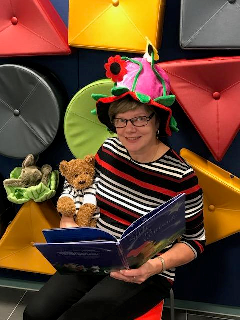 Kuvassa on kirjaston Niilo Nalle, joka on myös mukana kirjaston satutuokioilla. Syksyn 2025 satutuokioiden teemana on luonto, ja satutuokioissa luetaankin joka kerta jokin luontoon liittyvä kirja.