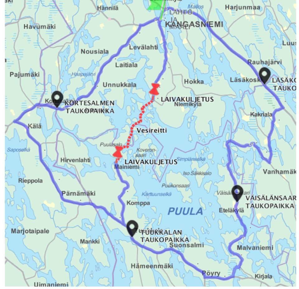 Voit pyöräillä koko 133 kilometrin matkan Puulan ympäri tai voit hypätä välillä lautan kyytiin yli Puulan, jolloin pyöräiltävää matkaa kertyy 106 kilometriä. Lautta kulkee väliä Käräjäniemi-Mainiemi. Lauttaan mahtuu rajoitetusti osallistujia, joten ole nopea, jos haluat varmistaa paikkasi. Ilmoittaudu kuntosarjaan, jos haluat polkea koko matkan Puulan ympäri. Jos haluat välillä lautan kyytiin, niin ilmoittaudu elämyssarjaan.