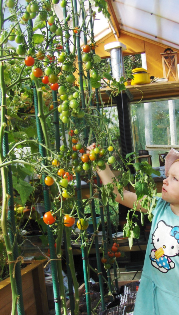 Kasvihuoneessa lapsenlapset katsovat kummissaan, kun puhun tomaateille: ”Puhutko sinä mummi noille aina?”