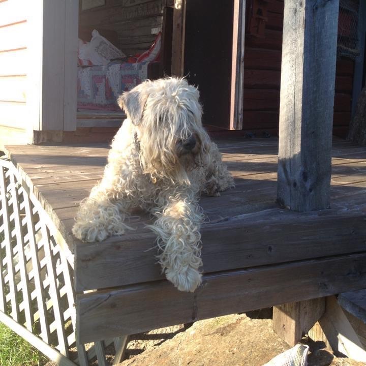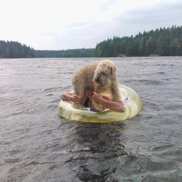 Pysähdymme istumaan kalliolle, jossa jo edesmennyt vehnäterrierini Heta sai aina hepulin. Se ajoi häntäänsä takaa, piehtaroi jäkälässä ja juoksi kalliolla rinkiä. Pian se oli sekamelska karvoja, varpuja ja jäkälää. Seisoi hajareisin ja huojui – pää oli pyörällä karusellijuoksusta.