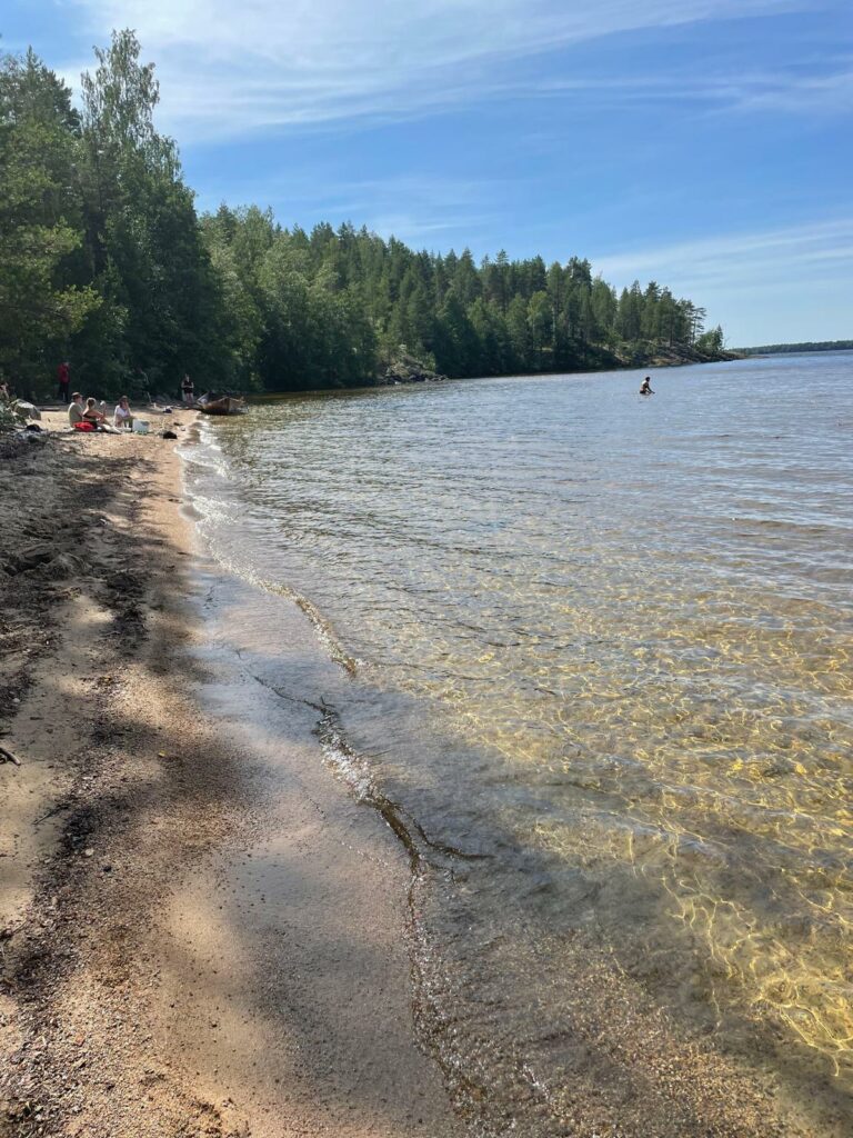 Puukonsaaren eteläpäästä löytyi retkeilijän paratiisi: monta sataa metriä hienoa hiekkarantaa. Vaihdoimme vaatteet uimapukuun ohuen lepän takana ja jätimme hiet tuulettumaan sen oksaan. Ranta oli matala, sellainen lapsiperheen unelmauimala. Vesi oli lämmintä ja hiekka varpaan alla pehmeää.