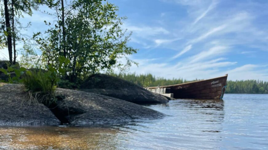 Kippari ohjasi Annimme Ison Paatsalon ja Hirsisaaren välistä pohjoispuolen retkisatamaan. Mainingeista ei ollut tietoakaan, aurinko paistoi lämpimästi, kesätuuli oli pumpulin kevyt ja järvi rauhallinen.