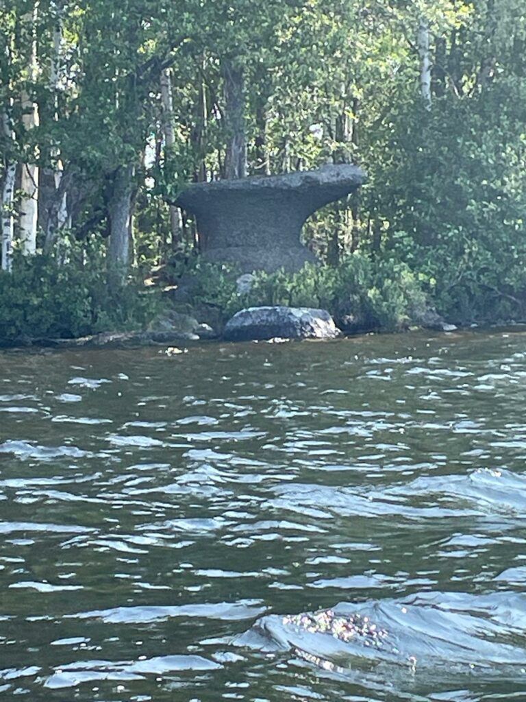 Tankkasimme juomaa ensimmäisen kerran Alttarisaarella, jossa pysähdyimme ihailemaan alttarikiveä. Se oli kuin suuri kantarelli, mahtava kivilohkare, jonka vesi oli aikojen saatossa rapauttanut nykyiseen muotoonsa. Raukkeja oli Puulalla siellä täällä, mutta tämä oli kuin seikkailupuistosta.