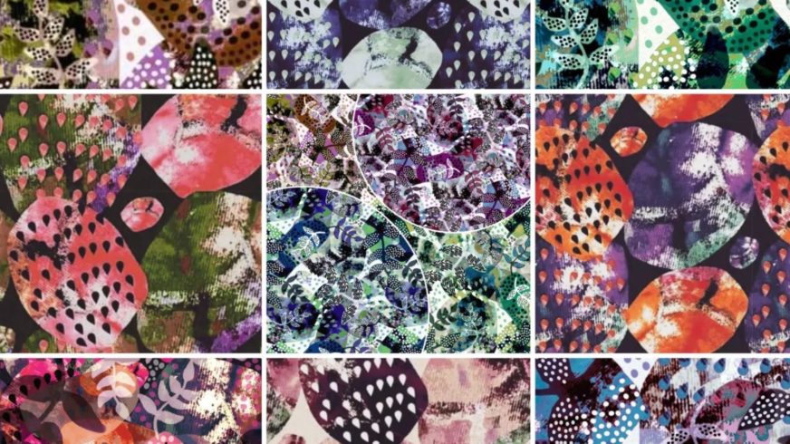”Kollaasi luonnoksista, joista osa valikoitui pinnoiksi tekstiiliteoksiin.”