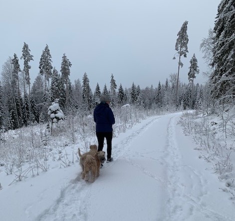 Koska naistenlehdet eivät kirjoita tavallisista ihmisistä, heistä ei saa tietää kotisohvalla istumalla. Mutta paljon voi havainnoida kyläteillä. Siksi me, kaksi vehnäterrieriäni ja minä, kävelemme Kangasniemen kylänraiteilla. Ja koska olen jäämässä pois työelämästä, kävelemme entistä useammin. Maailma kiinnostaa.