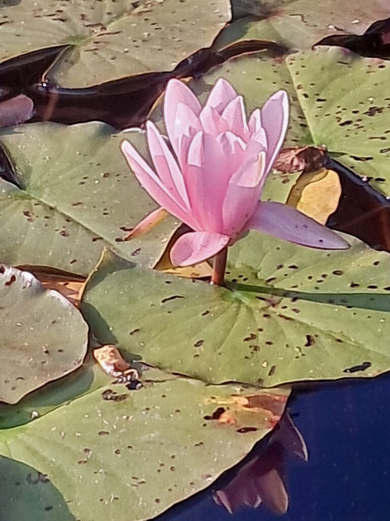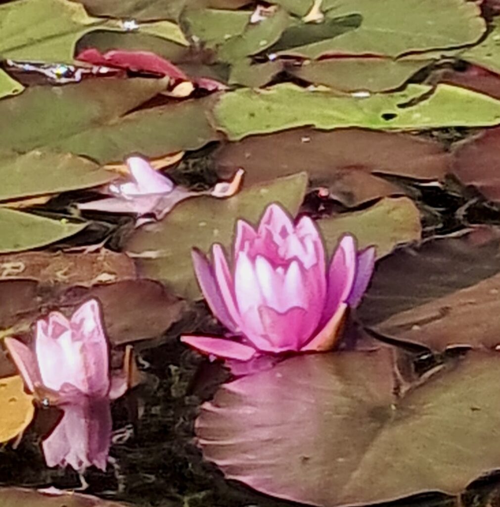 Rannassa kasvoi vaaleanpunaisia lumpeita. Osa niistä oli hentoja väriltään, osa melkein pinkkejä. Luonto oli antanut niille eri määrän punaista väriainetta.