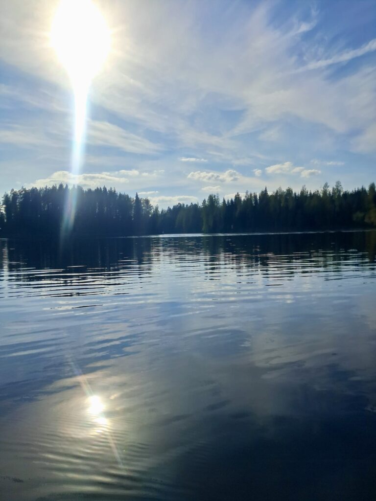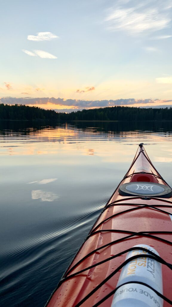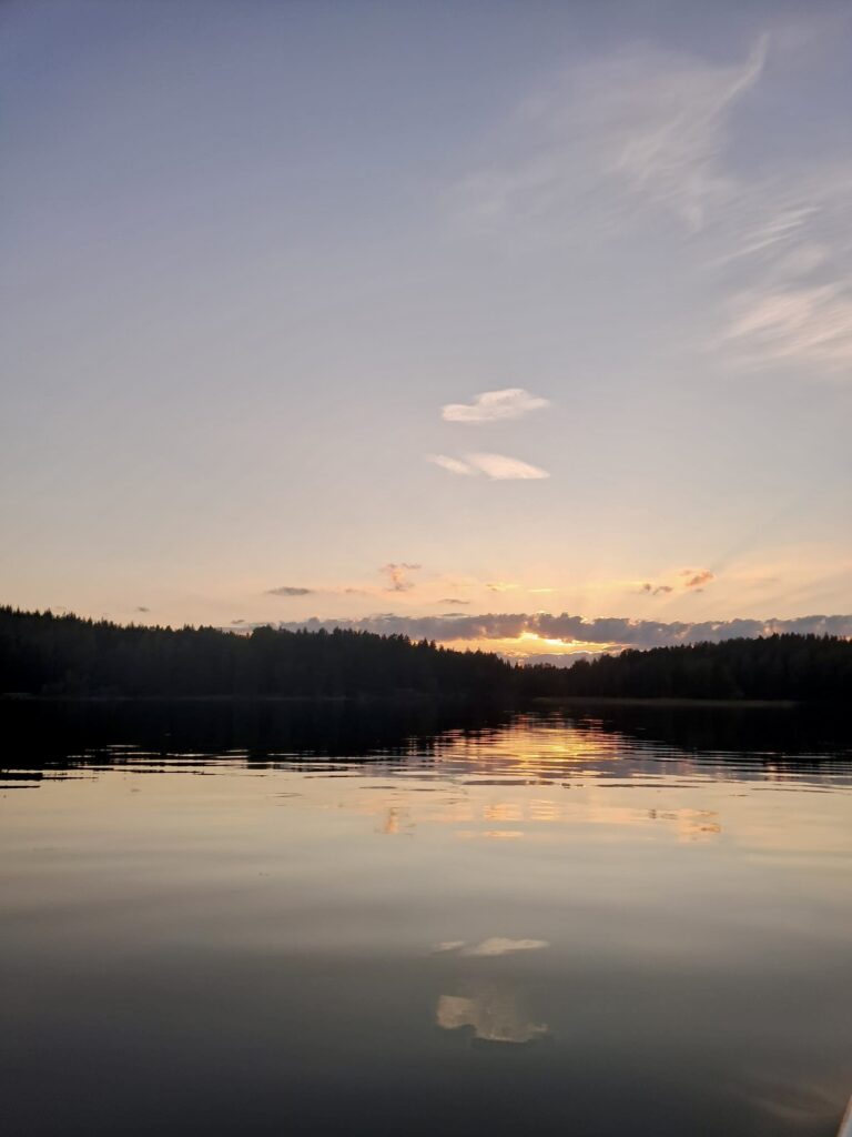 Saavuimme takaisin perille, kun aurinko enää pilkisteli metsän takaa. Vesi näytti entistä mustemmalta. Jossain kurahti kuikka. Mitään muuta ei kuulunut. Olimme taas yhtä hienoa kokemusta rikkaampia.
