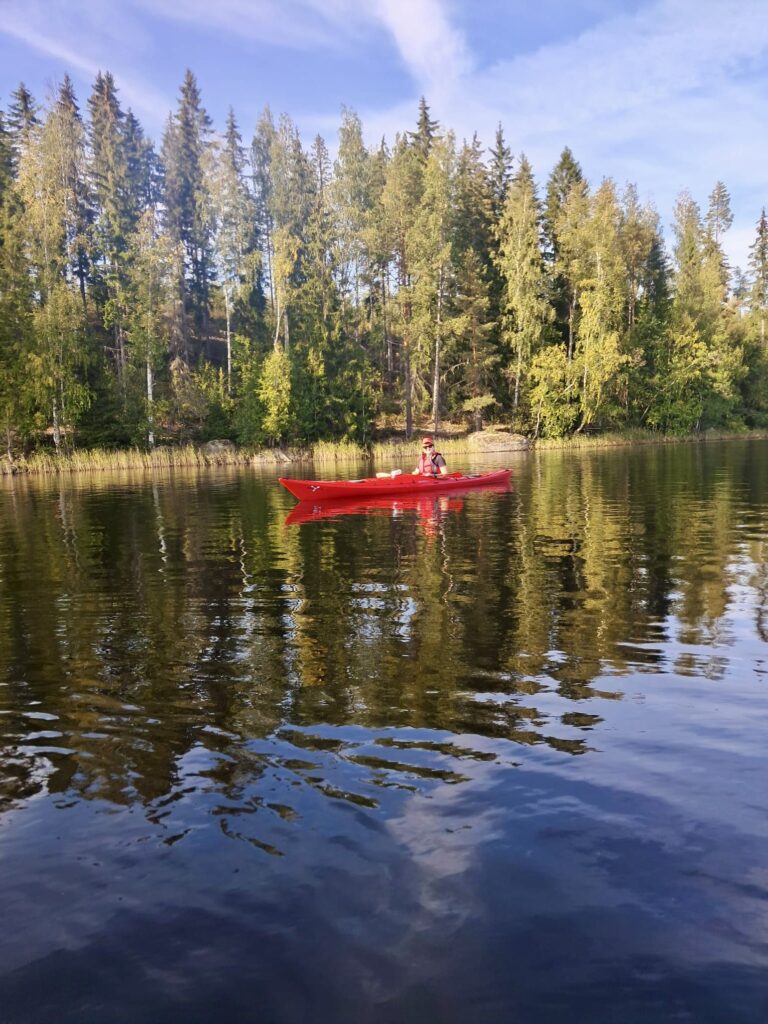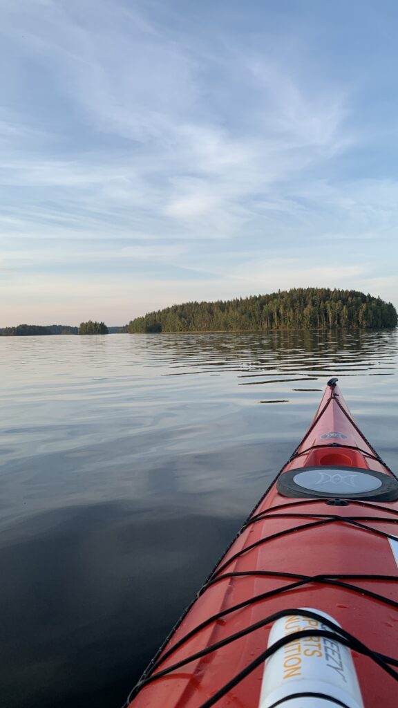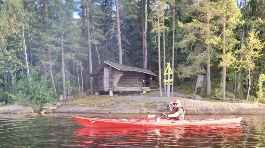 Nousimme kajakkeihin ja suuntasimme Puulansalmea kohti. Järvi oli peili ja seutu vaiti. Saattoi melkein kuulla, kuinka matsutaket, tuoksuvalmustakat, kasvoivat rantakallioilla mäntyjen juurella.