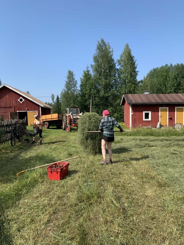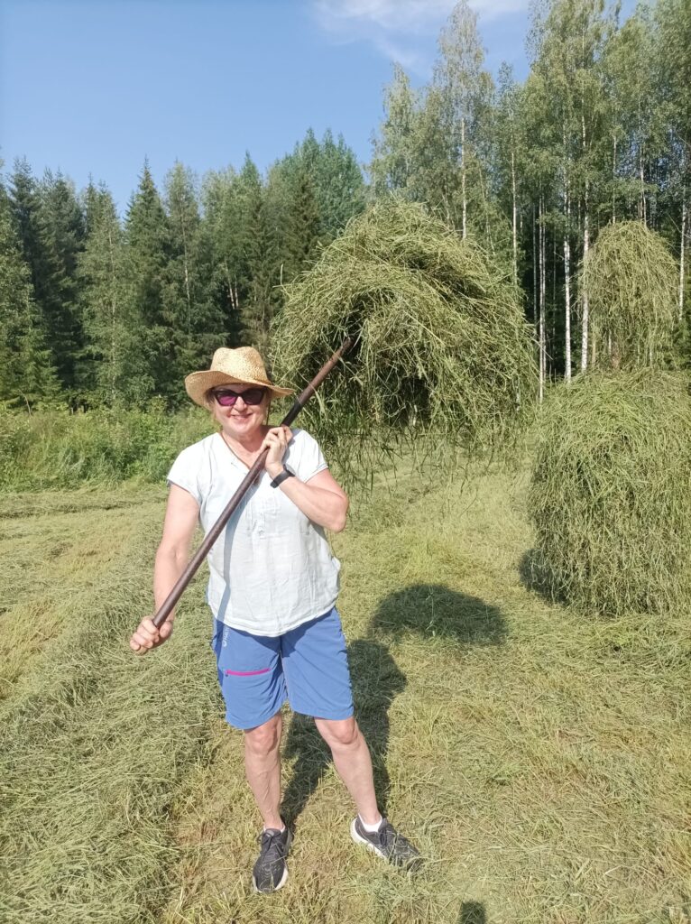 Hellekausi oli juuri tuloillaan, kun ajelimme Pirkko Pennalan kanssa Makkolaan päin. Tien varret olivat täynnä kukkia ja suorastaan sinisenään kissankelloja. Meitä vähän jännitti, sillä olimme matkalla heinätöihin. Siitä, kun nostimme heinää hangolla seipäille, oli aikaa monta kymmentä vuotta.