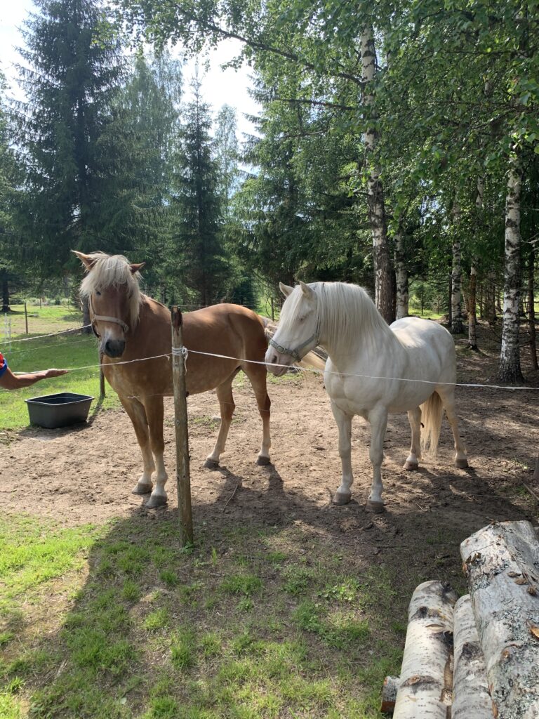 Toukolan kylätalon jälkeen kaarrettiin oikealle ja pian oltiin perillä. Tien varressa odottivat koko homman motivaattorit: ruskea suomenhevostamma Terttunen ja valkoinen eestinhevosruuna Vipsi.