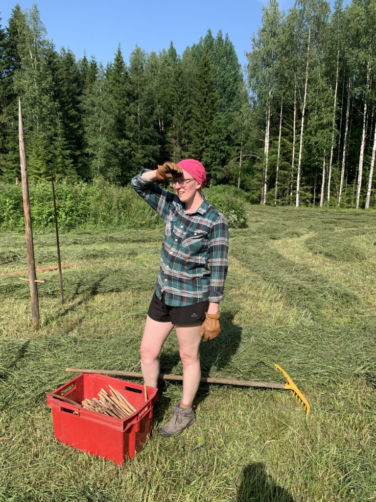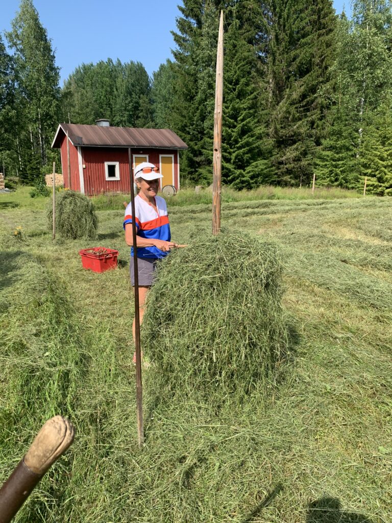 Minkä nuorena oppii, sen vanhana taitaa. Se huomattiin, kun tartuttiin monen kymmenen vuoden jälkeen hankoon ja luotiin heinää seipäälle. Kiitos Suville tästä nostalgiatuokiosta!