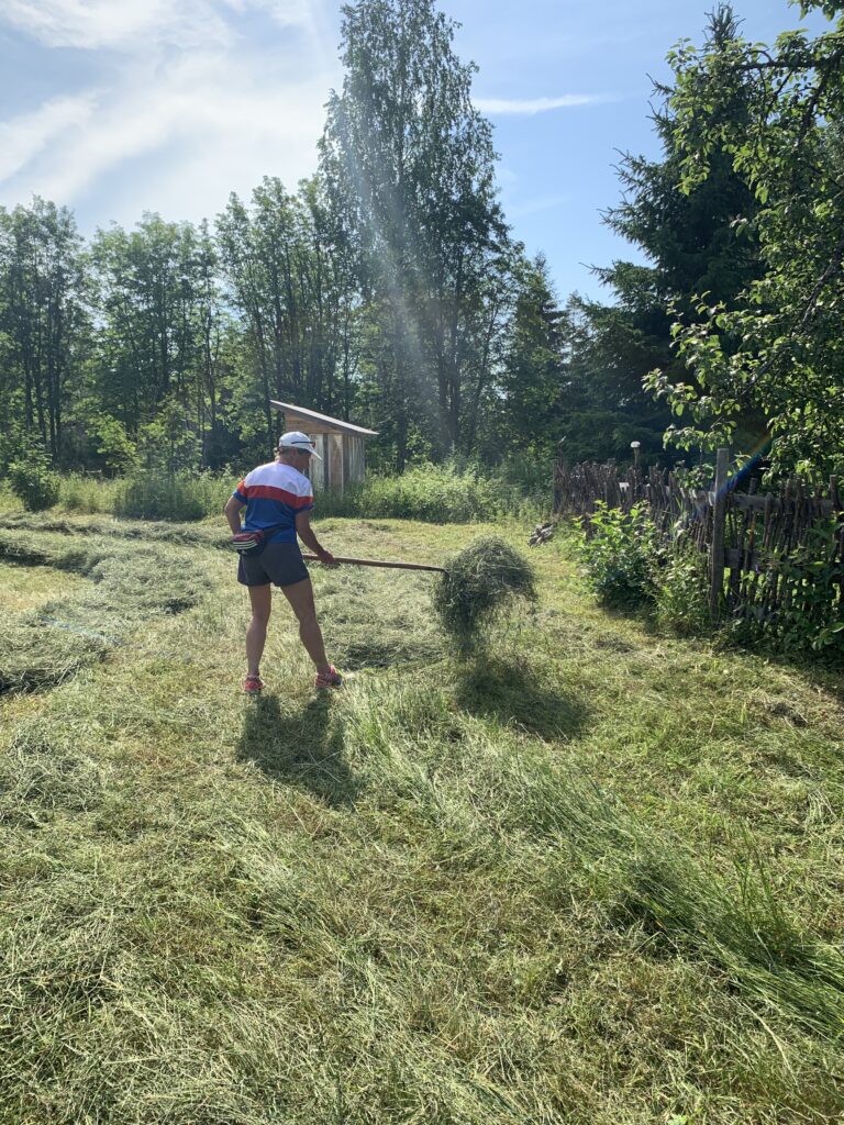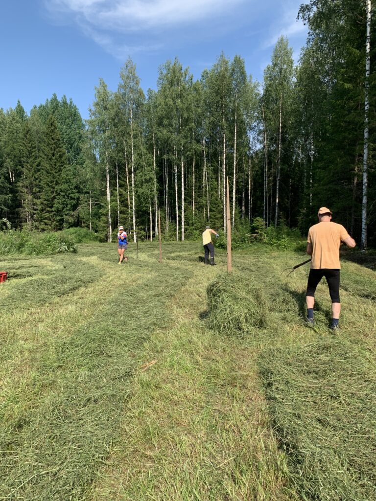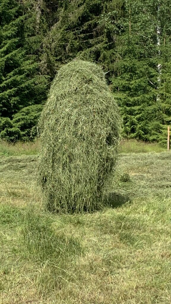 Seiväs saatiin pystyyn, poljettiin vielä tiukkaan kantapäällä, alin tappi paikoilleen ja sitten ryhdyimme nostamaan heinää seipäille. Se oli jo auringossa hyvän verran kuivahtanutta. Vanhojen oppien mukaan heinätukko nostettiin seipäälle niin, että se jäi reunastaan kiinni. Tämä heinä oli sen verran lyhyttä, että mummolan neuvoja jouduttiin soveltamaan ja laittamaan tukko aika lailla keskeltä.