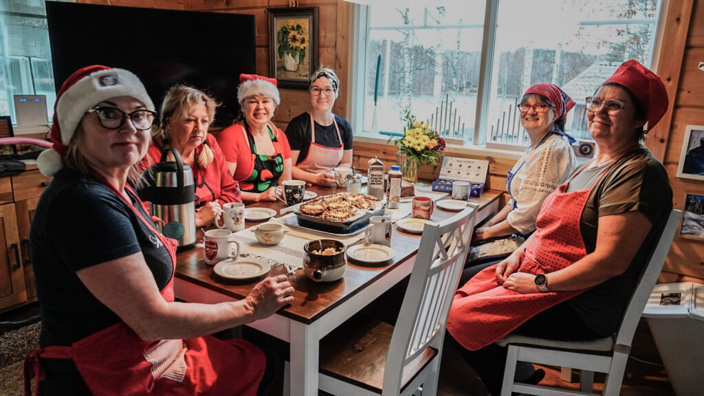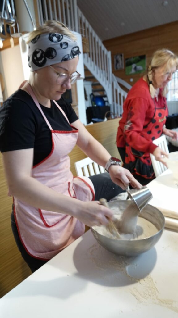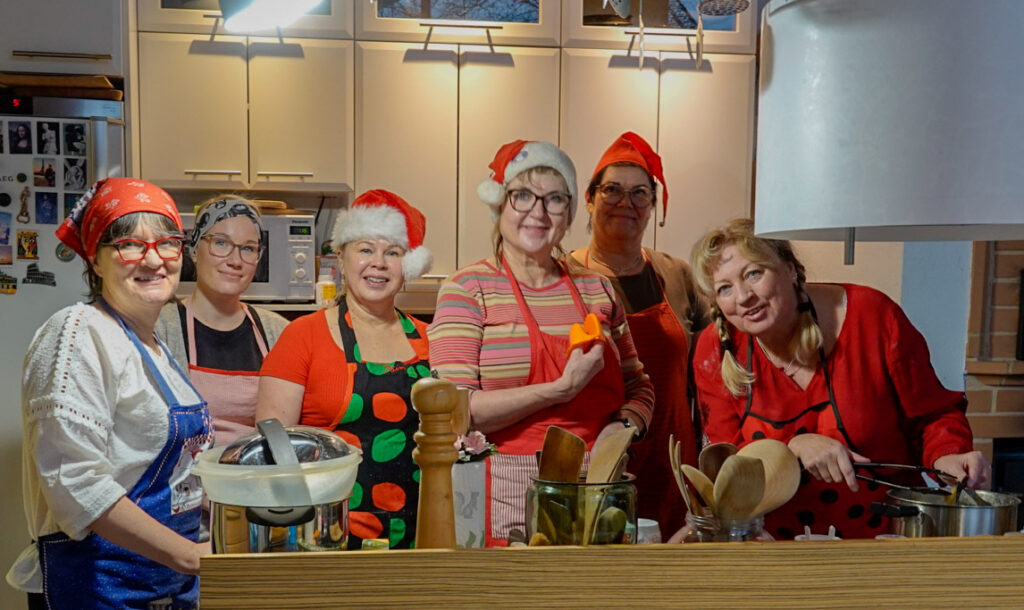 Puheenporina pöydän ympärillä vilkastuu, välillä pärskyy nauru. Piirakan tuotantoprosessi muotoutuu nopeasti omiin uomiinsa. Jokaisen vahvuudet löytyvät, ja työnjako syntyy itsestään.