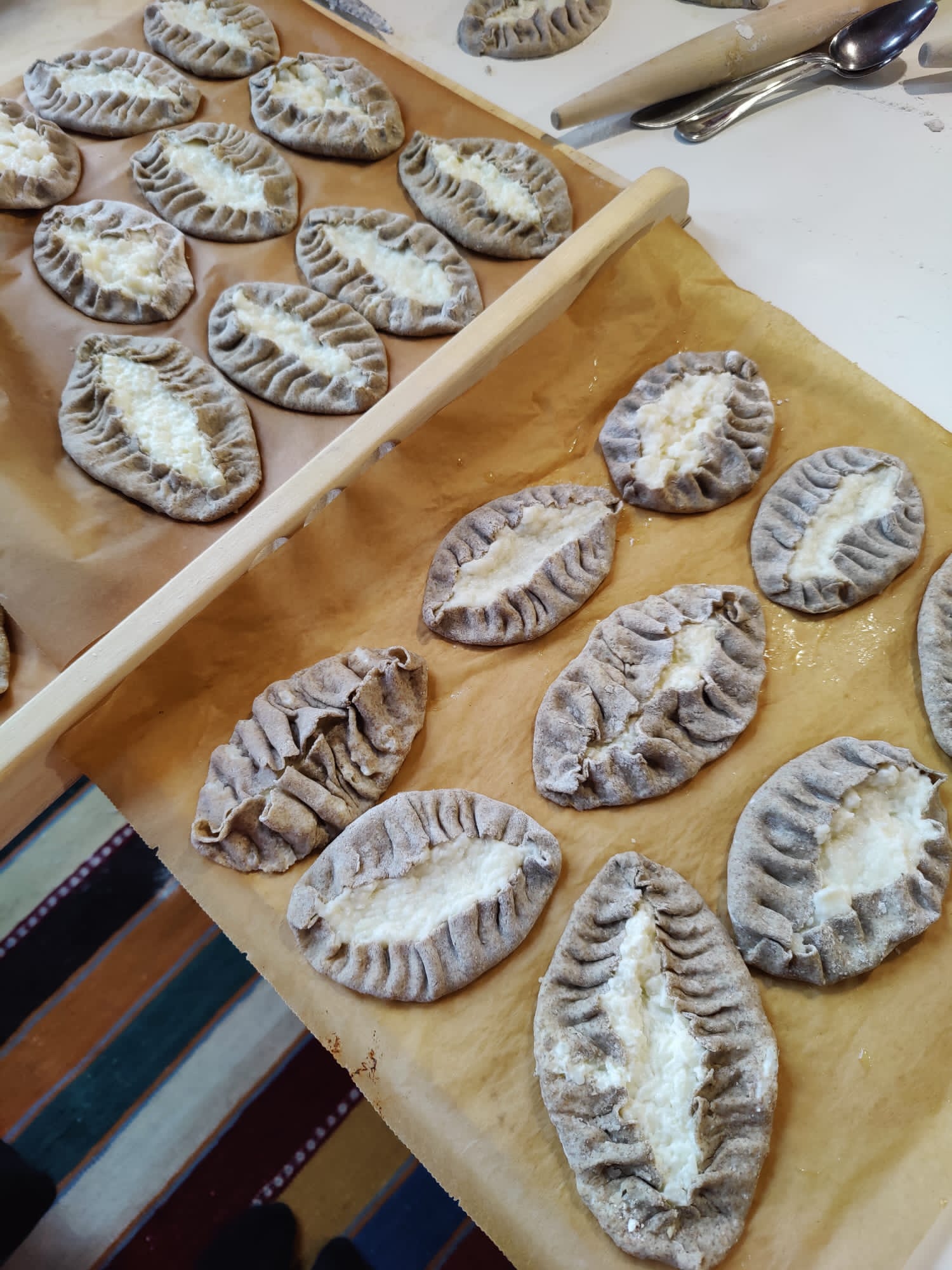 Sitten pidetään kahvitauko, maistetaan piirakoita ja puretaan uunin eteen syntynyttä peltisumaa. Kaksi uunia ei vedä niin paljoa kuin viidet kädet suoltavat. Lämpimät piirakat ovat suussa sulavia ja herkullisia. Ruis ja voi on ihanaa. Pitäkööt Ranskassa croissanttinsa ja Välimerellä oliiviöljynsä.
