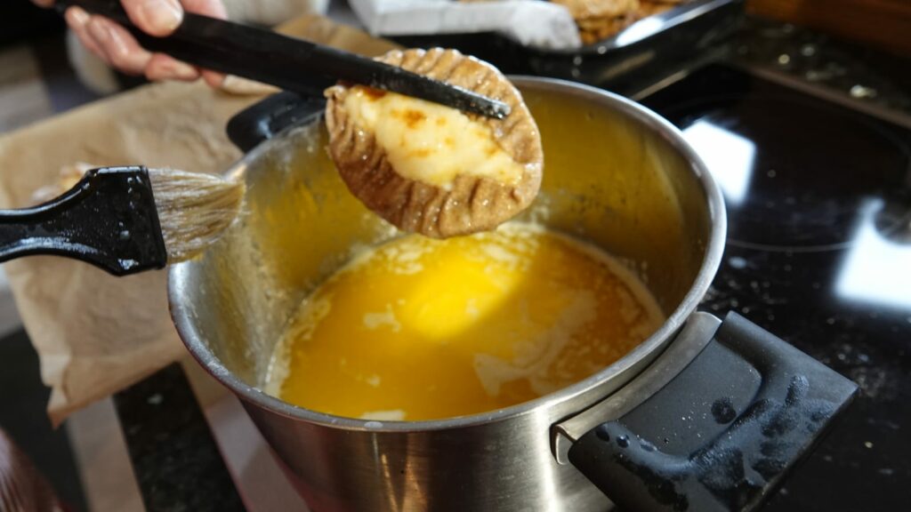 Uunin jälkeen on voitelupiste. Kattilassa on ehtaa voita eikä mitään maidolla jatkettua. Syödään oliiviöljyä jonain toisena päivänä. Piirakka voidellaan ympäriinsä ja laitetaan pyyhkeen alle pehmenemään.