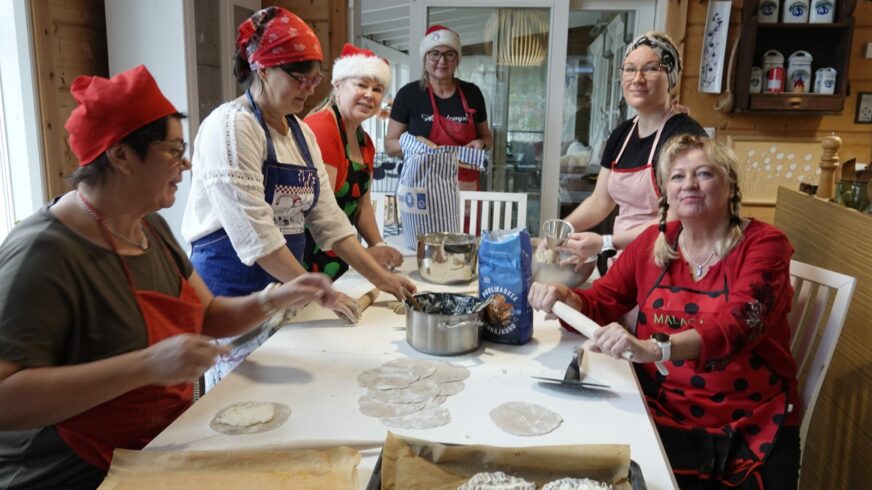 Puolen päivän kieppeillä on jo syntynyt Soipukansaaren piirakkatalkoiden standardimalli, eikä kukaan tee enää omanlaisiaan. Ryhmässä on voimaa. Pöydän ympärillä syntyy niin tasalaatuisia piirakoita, että ne kelpaisivat Hokan joulutorillekin.