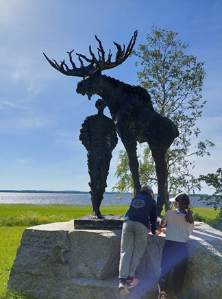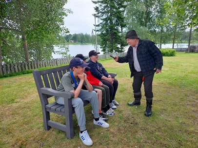 Päivää vietettiin Sotkamon historiaan ja Veikko Huoviseen tutustuen. Iltasaduksi olimme kuulleet Konsta Pylkkäsen elämästä virittäytyen ensimmäisen leiripäivän ohjelmaan. Automme pysähtyi ensimmäiseksi Havukka-ahon ajattelija -patsaan kohdalle. Patsaalta löysimme Veikko Huovisen Konsta Pylkkäselle kirjoittaman ajatuksen maailmasta ja ihmisestä: “Ihmisellä on tässä avaruudessa kusiaisen valtuudet.”