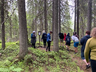 Rosvopaistin kypsyessä kuopassaan jatkoimme vielä hetken Huovisen jalanjäljillä tutustuen Huovisnäreikköön. Huovisnäreikkö on Veikko Huovisen nimikkometsä. Polun varrelta löytyy Veikko Huovisen valitsemia ajatuksia Puukansan tarina -kirjasta. Veikko Huovinen arvosti luontoa ja metsää niinpä nimikkometsä on sopiva hänen elämäntyönsä muistomerkiksi. https://www.sotkamo.fi/vapaa-aika/kulttuuritoimi/nahtavyydet/huovishuone/huovisnareikko/