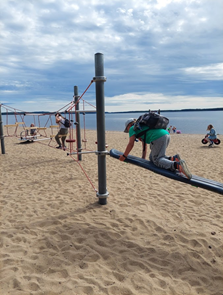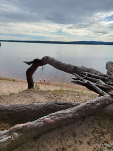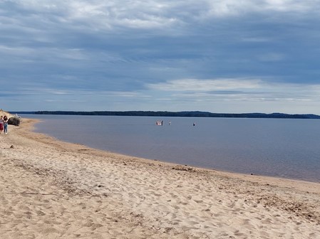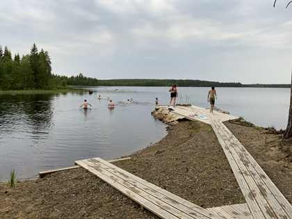 Herkkuvarastot saimme täyteen kaupoista ja jätskit herkuttelimme torilla. Seurasimme torin jäätelökojulta kuinka ihmisiä käveli suurin joukoin kohti Hiukkaa, oli lapsia, nuoria ja aikuisia, näyttivät pesäpalloilijoilta. Ja sitä monet olivatkin, tai ainakin faneja. Jymyn peli oli alkamassa. Sotkamo on pesäpallopaikkakunta. Me emme menneet katsomaan peliä vaan kävelimme pesäpallostadionin ohi Hiukan hiekkarannalle nauttimaan aurinkoisesta ja lämpöisestä kesäpäivästä. Partiolaiset innostuivat loikkaamaan vielä eilistä historiapäivää kauemmas historiassa ja tekivät yhdestä toveristaan muumion rantahiekkaan. Hiukan upeat maisemat ja hiekka varpaiden välissä riitti meille aikuisille, mutta lapset tarkenivat uimaankin.