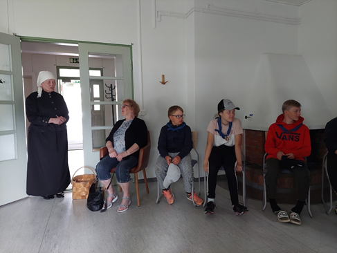 Sen jälkeen lähdimme aikamatkalle. Niemelän saliin meitä tuli tapaamaan Amanda Klemetti vuodelta 1900. Hän kertoi meille värikkäästä elämästään kauppiaan rouvana Sotkamossa 1800-luvun lopulla. Lähimpään kaupunkiin, Kajaaniin, kuljettiin tuolloin laivalla. Amanda olikin tuonut meille kaupungista tuliaisina nekkuja.