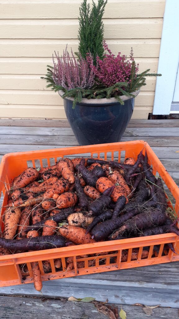 Purolan kellari on oikein mainio peruna- ja hillokellari, mutta porkkanoita ja punajuuria en ole siellä saanut säilöttyä. Tämän takia syksyn porkkanasato on jatkojalostettava melko pian sadonkorjuun jälkeen. Nyt on jo tuvan leivinuunissa paistetut porkkanalaatikot pakastimessa jouluksi valmiina. Porkkanaraastepussit ja porkkanapiirakat sain myös tungettua lähes täpötäysiin pakastimiin. Syksyn viimeiset punajuuret odottavat vielä muuttumista risotoksi ja laatikoksi.