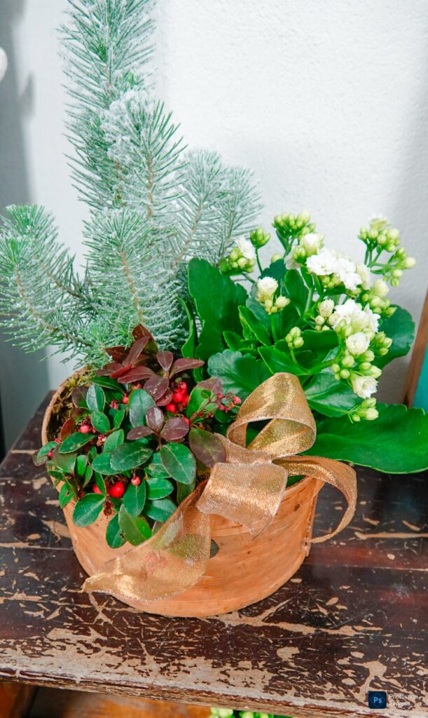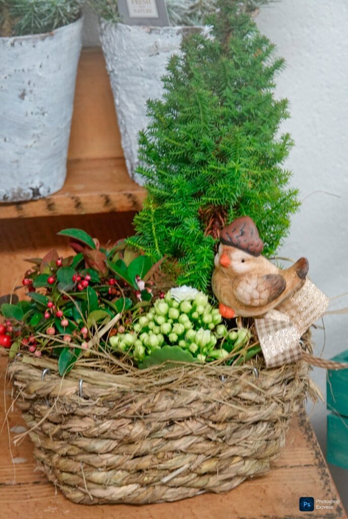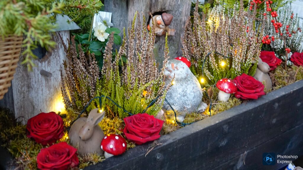 Punaiset ruusut kukkivat kukkapuodin ovella kanervien, tonttujen ja sammaleen seurassa. Lämmin, keltainen valo pujottelee niiden välissä. Se muistuttaa meitä pakoon juosseesta auringosta ja antaa toivoa sen paluusta.