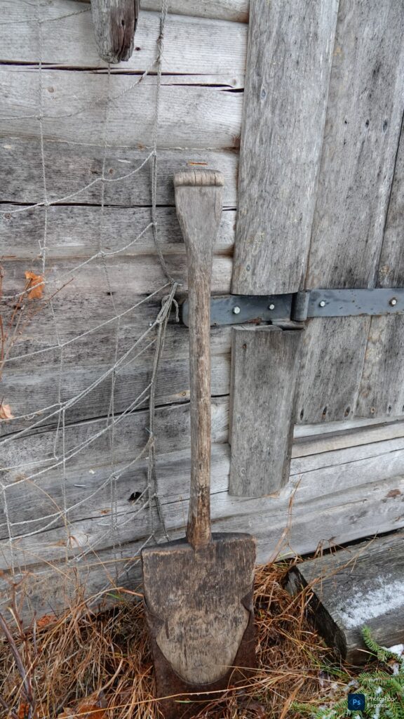Painava rautakärkinen lapio on tehty aikana, jolloin rauta oli kallista ja niukasti saatavilla. Sitä riitti vain lapion kärkeen. Lapio painaa niin paljon, että ihan heiveröinen ihminen sitä ei heiluttele.