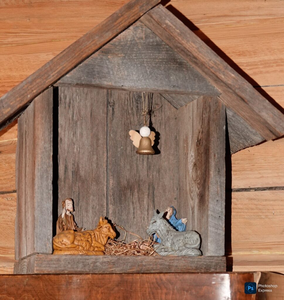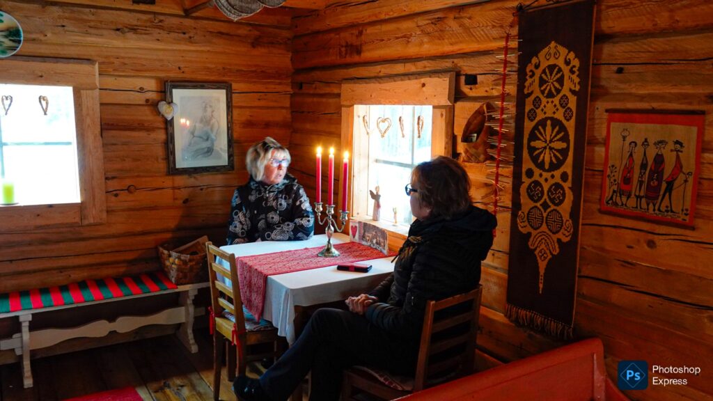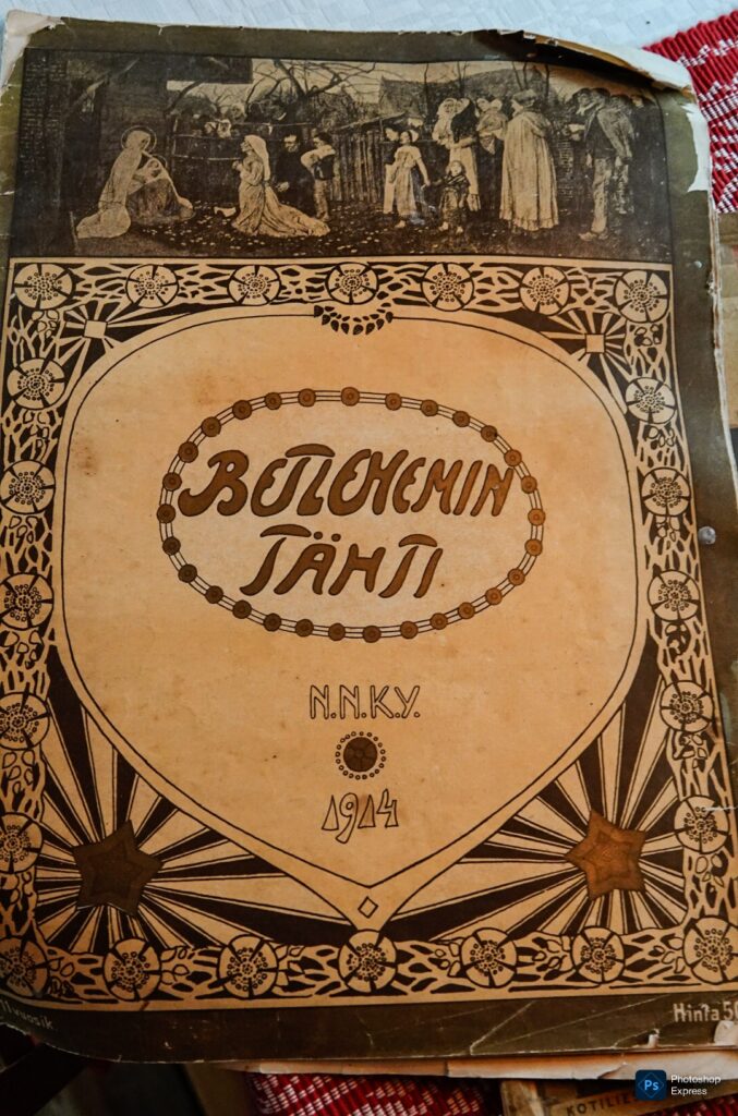Katselemme verkkaan yli satavuotiaita lehtiä. Annamme ajatuksen edesmenneille sukupolville ja mietimme, miten erilaisessa maailmassa he elivätkään. Vartaassa katossa on kymmenkunta reikäleipää. Tuohikontti on täynnä lasten kirjeitä joulupukille.