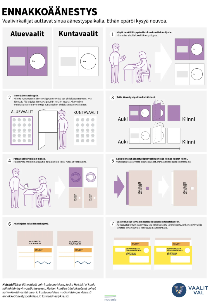 - Äänestäjä saa kaksi äänestyslippua, perinteinen valkoinen, jolla äänestetään kuntavaalien ehdokasta ja violetti, jolla äänestetään aluevaalien ehdokasta.