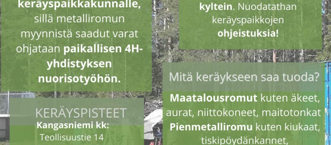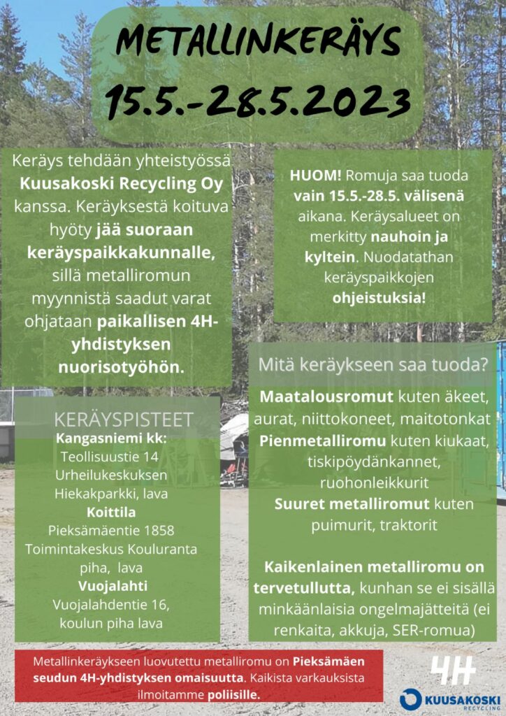 Metallinkeräys aika on 15.5.-28.5. ja tuotot menevät paikkakunnan 4H-nuorisotyöhön.