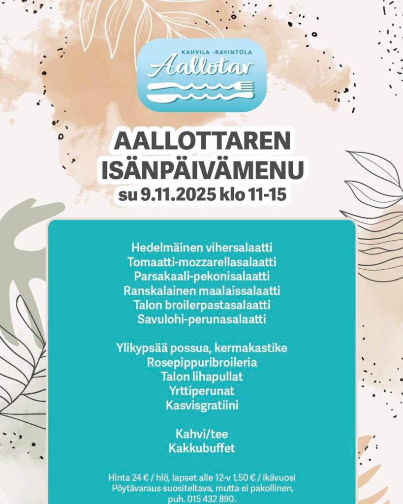 Isänpäivän lounaalle pöytävaraus on suositeltavaa, muttei pakollista; kattaus klo 11-15! (015-432890)