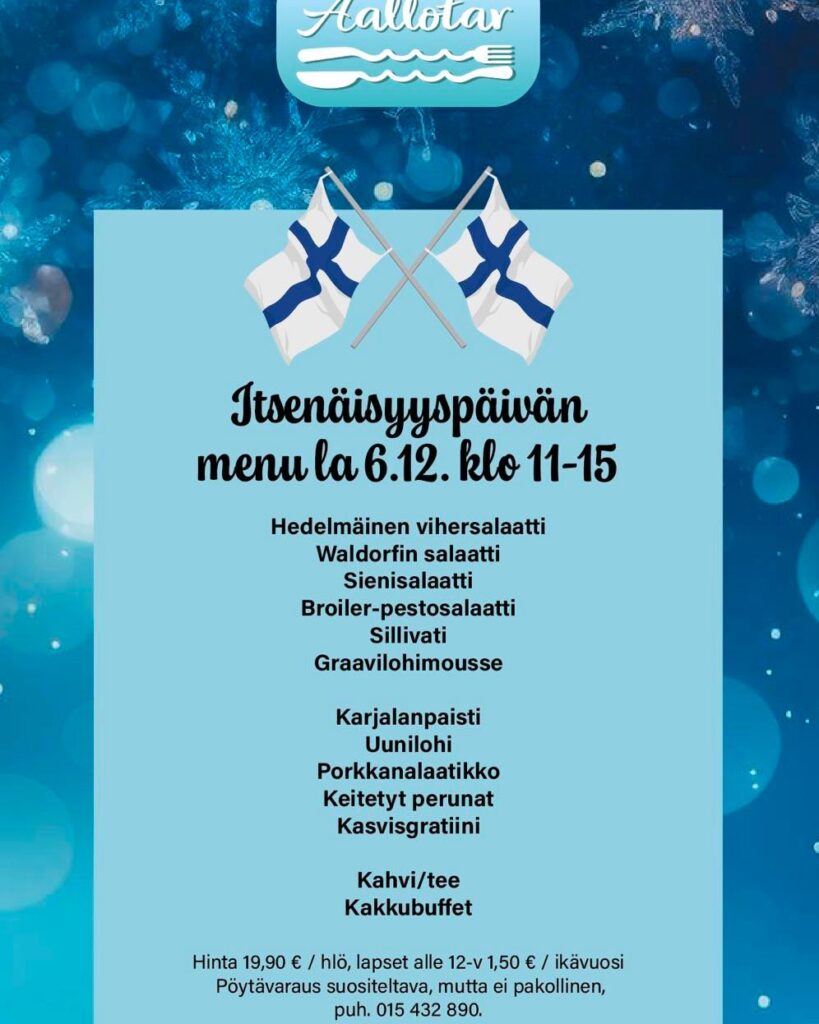 Lauantaina juhlistetaan Itsenäisyyspäivää juhlalounaan merkeissä; pöytävaraus suositeltava, muttei pakollinen!