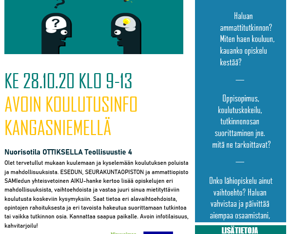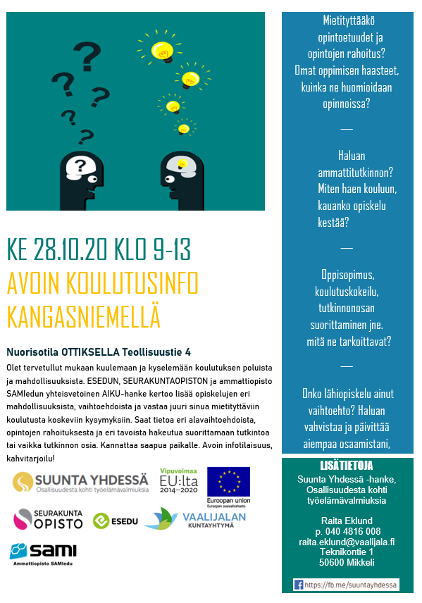 Olet tervetullut mukaan kuulemaan ja kyselemään koulutuksen poluista ja mahdollisuuksista. ESEDUN, SEURAKUNTAOPISTON ja ammattiopisto SAMIedun yhteisvetoinen AIKU-hanke kertoo lisää opiskelujen eri mahdollisuuksista, vaihtoehdoista ja vastaa juuri sinua mietityttäviin koulutusta koskeviin kysymyksiin. Saat tietoa eri alavaihtoehdoista, opintojen rahoituksesta ja eri tavoista hakeutua suorittamaan tutkintoa tai vaikka tutkinnon osia.