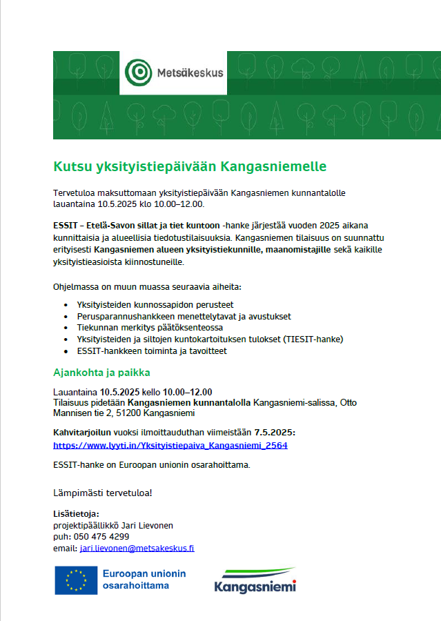 ESSIT – Etelä-Savon sillat ja tiet kuntoon -hanke järjestää vuoden 2025 aikana kunnittaisia ja alueellisia tiedotustilaisuuksia. Kangasniemen tilaisuus on suunnattu erityisesti Kangasniemen alueen yksityistiekunnille, maanomistajille sekä kaikille yksityistieasioista kiinnostuneille.