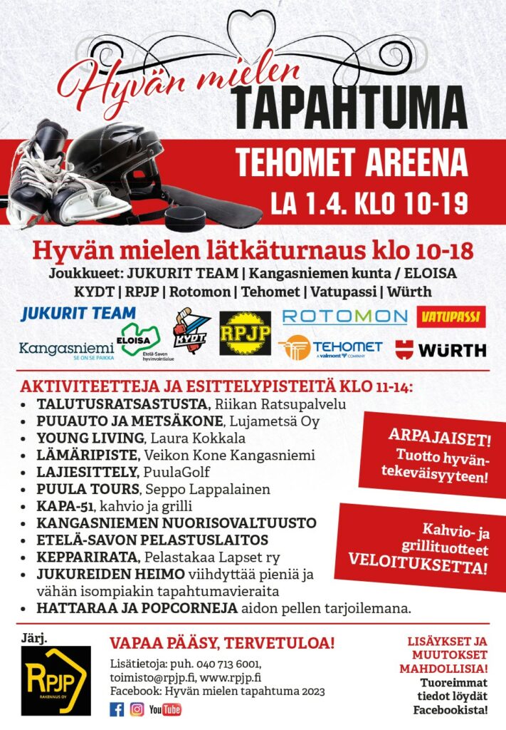 Tapahtumassa pelataan perinteinen Hyvän Mielen Lätkäturnaus sekä turnauksen lisäksi päivän aikana on luvassa monenlaista muuta ohjelmaa sekä aktiviteettia! Järj. RPJP