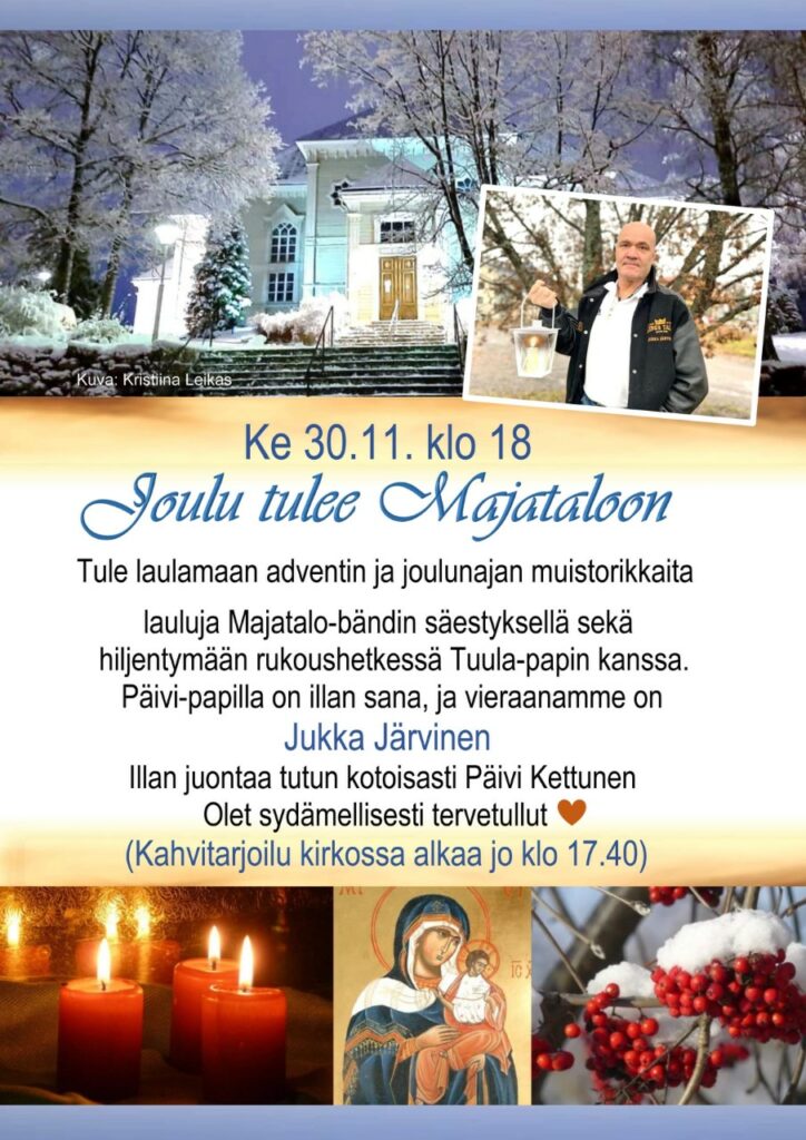 Tervetuloa jouluiseen majataloiltaan Kangasniemen kirkkoon. Lauletaan adventin ja joulun ajan lauluja Majatalobändin säestyksellä. Vieraana on Jukka Järvinen, Päivi Kettunen juontaa, Tuula Suuronen pitää rukoushetken ja Päivi Liukkosella on illan sana. Kahvitarjoilu alkaa jo klo 17.40.