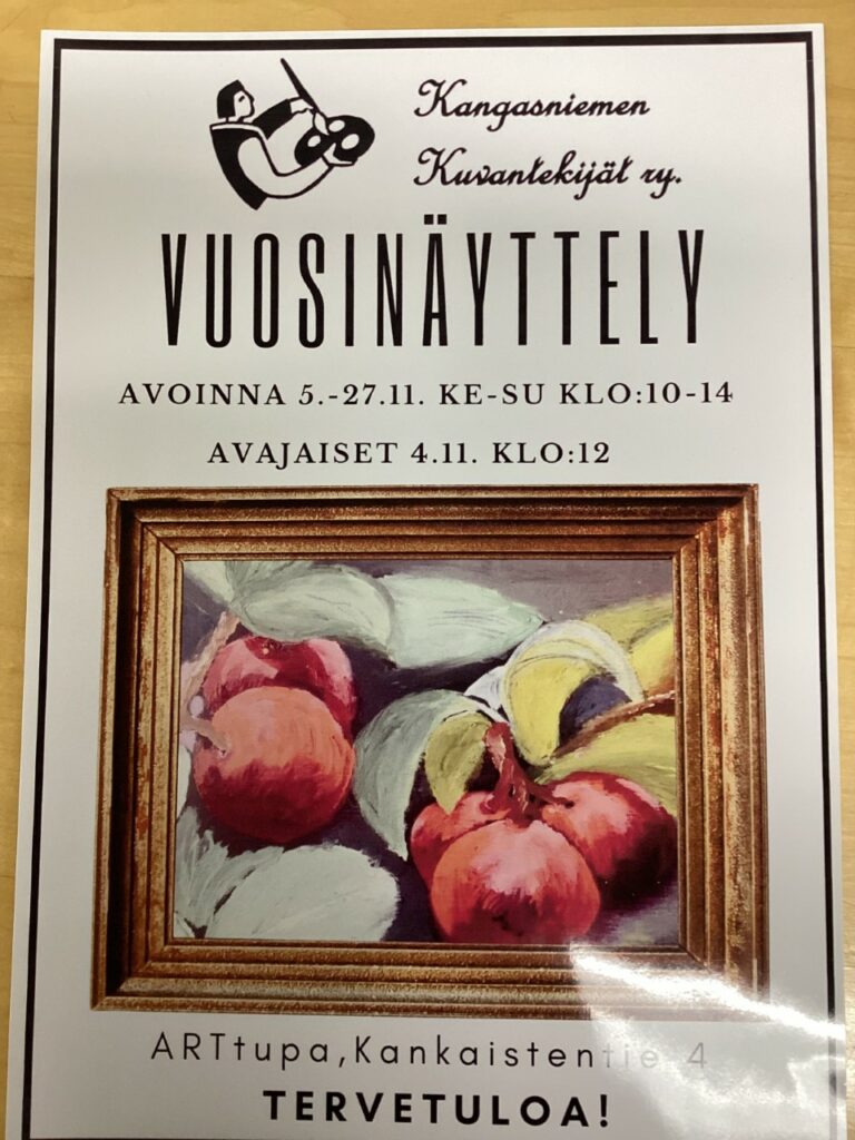 Kangasniemen Kuvantekijät ry vuosinäyttely Näyttely avoinna ke-su klo 10-14. Vapaa pääsy! Tapahtuman tiedot Päivämäärä Alkaa: 5.11.2022 klo 10.00 Päättyy: 27.11.2022 klo 14.00 Tapahtuman sijainti ARTtupa, Kankaistentie 4 Tapahtumaluokka Näyttely