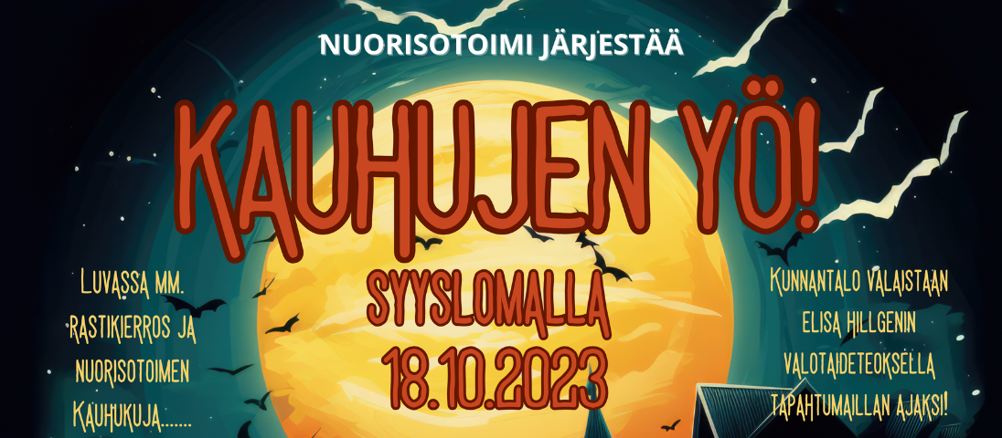 Syyslomaviikolla keskiviikkona 18.10. lapsille ja nuorille tarjolla nuorisotoimen ja yhteiskumppanien toimesta monenlaista tekemistä: kauhuelokuva, rastikierros, kirjaston nuotiopiiri, kauhukuja, halloween bileet ym.