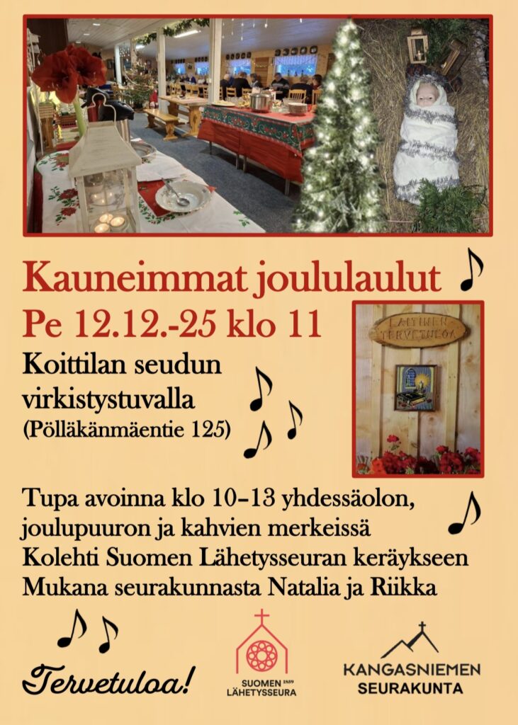 Koittilan seudun virkistystuvan yhteydessä pe 12.12.25 klo 11.15 -12.15 lauletaan Kauneimpia joululauluja kanttori Natalia Ikosen säestämänä. Virkistystupa on auki klo 10-13 yhdessäolon ja jouluun hiljentymisen merkeissä. Tarjolla on joulupuuroa ja -torttuja sekä kahvia ja glögiä.