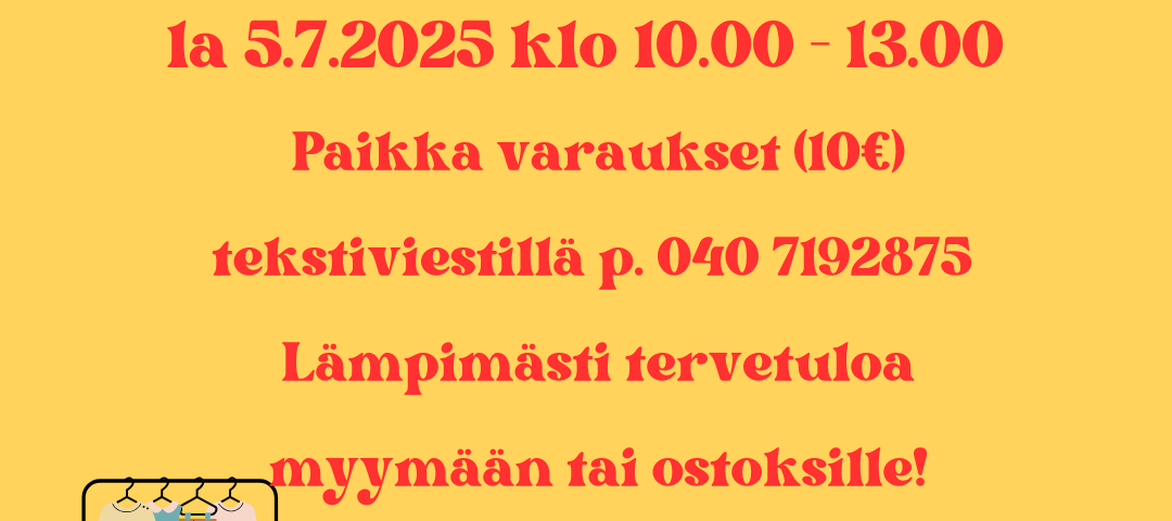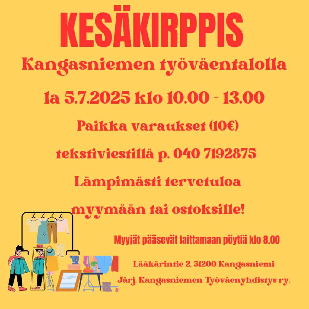 Kesäkirppis Kangasniemen Työväentalolla 5.7.2025 klo 10.00-13.00. Varattavissa ulko- tai sisäpaikkoja, paikkamaksu 10 € Pöytävataukset tekstiviestillä p. 040 7192875! Lämpimästi tervetuloa ostoksille tai myymään.