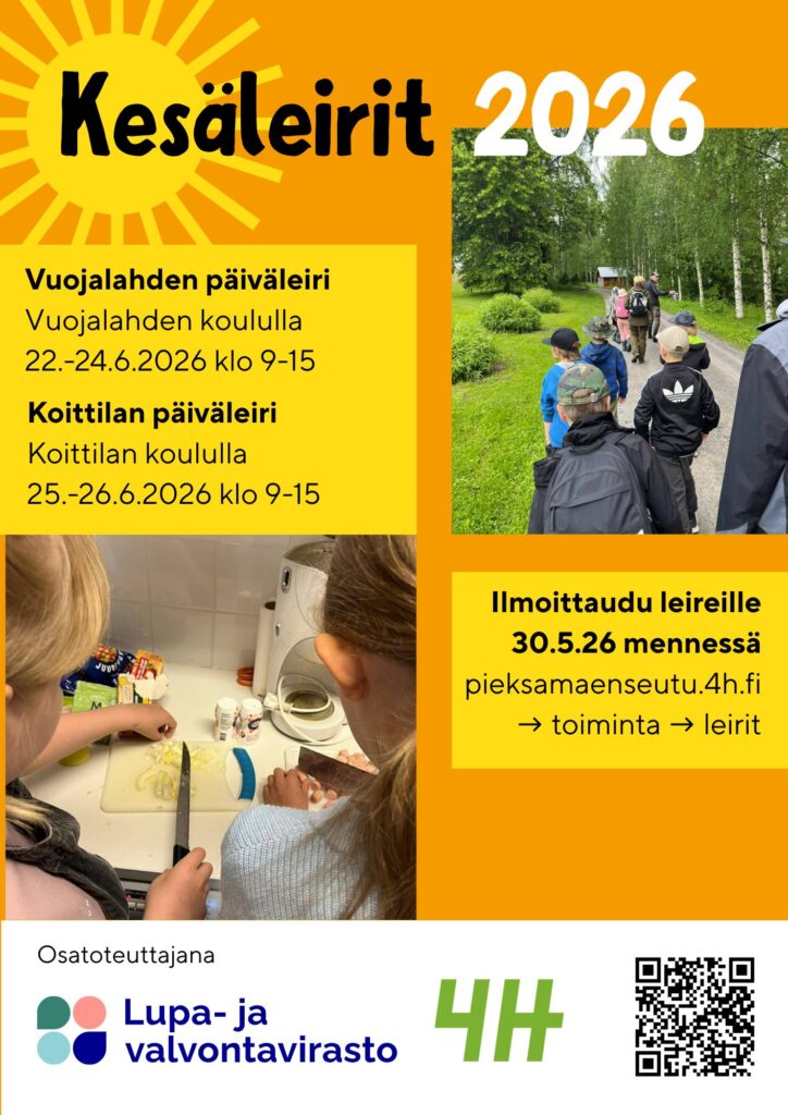 Sitovat ilmoittautumiset 30.5.2026 mennessä https://pieksamaenseutu.4h.fi/toiminta/leirit/