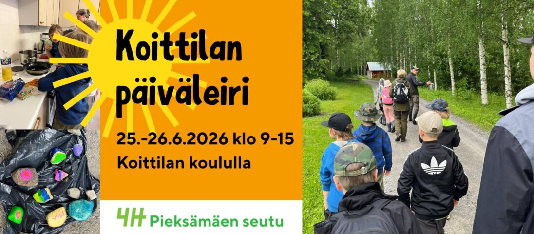 Koittilan kesäleiri 25.-26.6.2026 klo 9-15. Leirimaksu 16 € sisältäen lounaan ja päiväjuoman, ohjelman ja vakuutuksen. Ilmoittaudu 30.5.2026 mennessä pieksamaenseutu.4h.fi -> toiminta -> leirit
