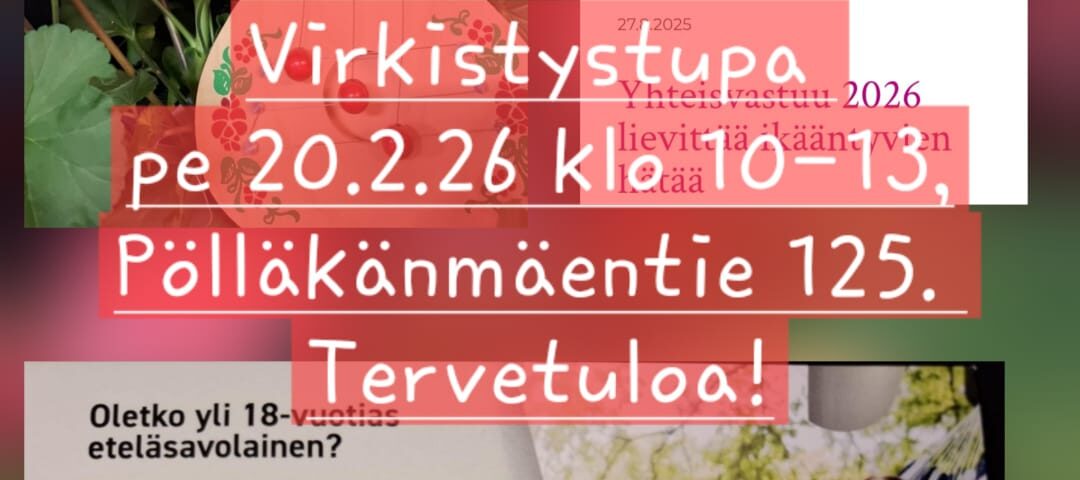 🏠Virkistystupa on auki jälleen ensi perjantaina 20.2.26 klo 10-13 Pölläkänmäen Laitisilla, Pölläkänmäentie 125. Ajankohtaisina aiheina hyvinvointikysely, yhteisvastuukeräys ja ystävätoiminta. Tervetuloa💞