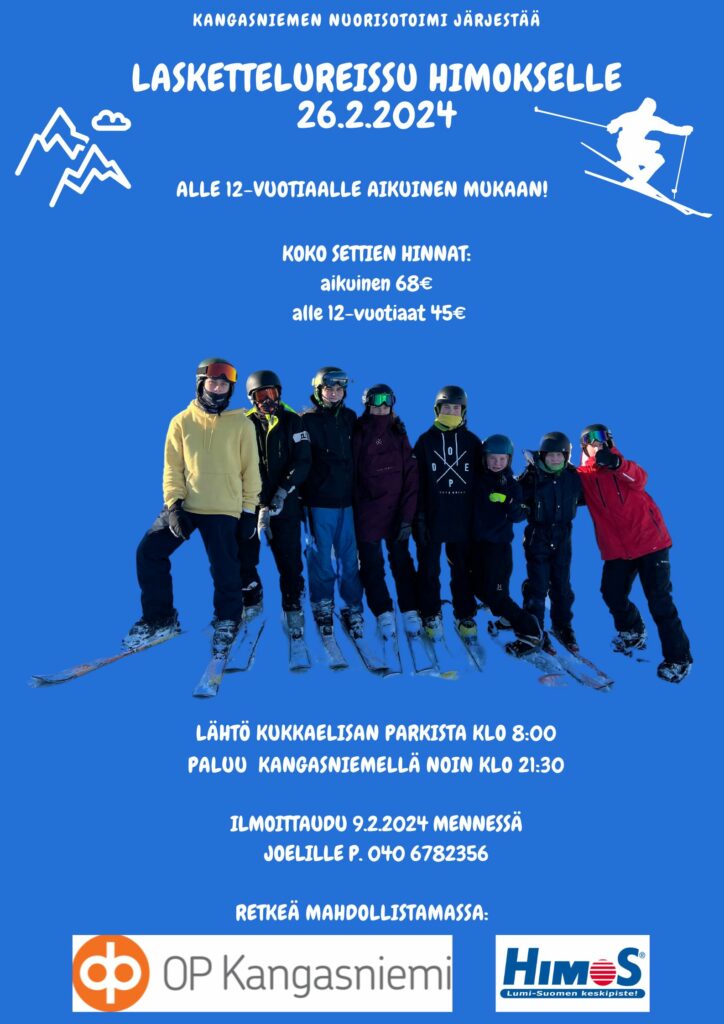 Kangasniemen nuorisotoimi järjestää laskettelureissun Himokselle 26.2.24. Kuljetus on ilmainen! Tapahtuma on avoin kaikille. Alle 12- vuotiaalle aikuinen mukaan! Ilmoittautuminen 9.2.24 mennessä Joelille whatsappiin Puh. 0406782356 Retken hinnasto: -Nuorisotoimen hinta nuorelle/aikuiselle: -Hissilippu 25e -Varustevuokra 38e -Kypärä 5e =68e koko setti aikuiselle Nuorisotoimen hinta lapselle (7–11 v): -Hissilippu 20e -Varustevuokra 25e (sis. Kypärä) = koko setti lapselle 45e