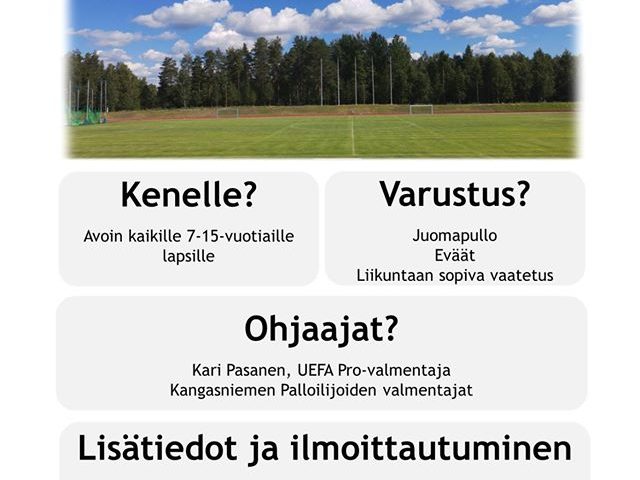 Kangasniemen Palloilijat järjestää lauantaina 25.7 kaikille 7-15-vuotiaille lapsille avoimen jalkapallopäivän. Luvassa on mukavaa touhuamista jalkapallon parissa ikäryhmittäin. Jalkapallopäivän vastuuvetäjinä toimivat Kari Pasanen (UEFA Pro-valmentaja) sekä Kangasniemen Palloilijoiden muut valmentajat.