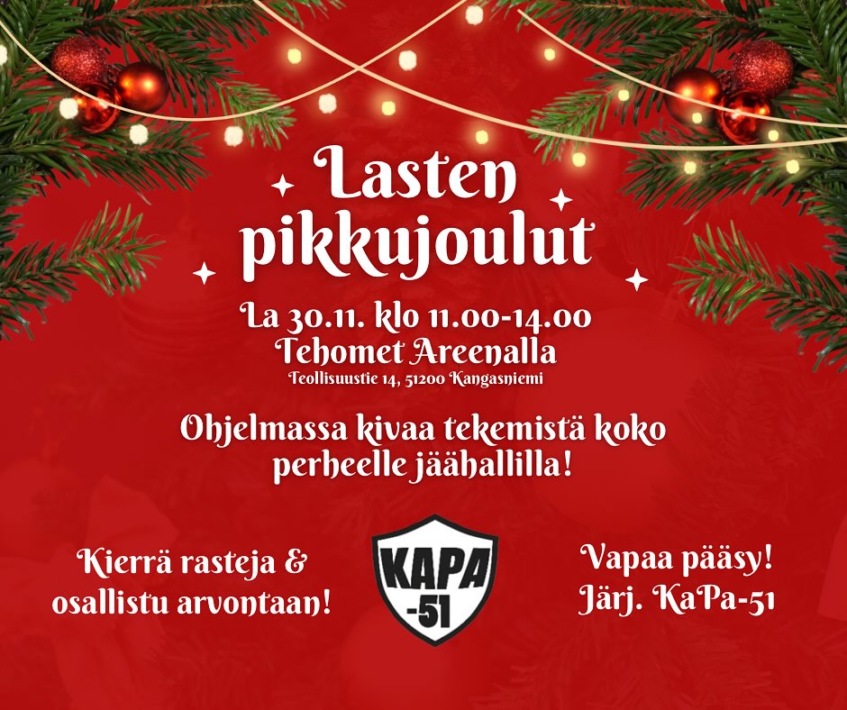 Lasten Pikkujoulut Vapaa pääsy! Tehomet Areena Tapahtuman tiedot Päivämäärä Alkaa: 30.11.2024 klo 11.00 Päättyy: 30.11.2024 klo 14.00 Tapahtuman sijainti Tehomet Areena, Teollisuustie 14 Tapahtumaluokka Joulu Lapset Liikunta ja urheilu Perhe