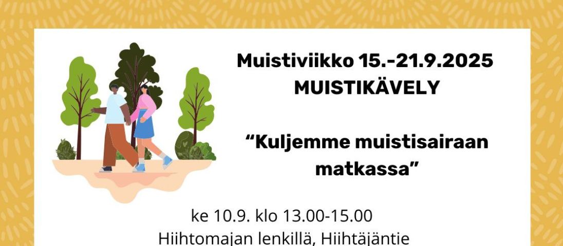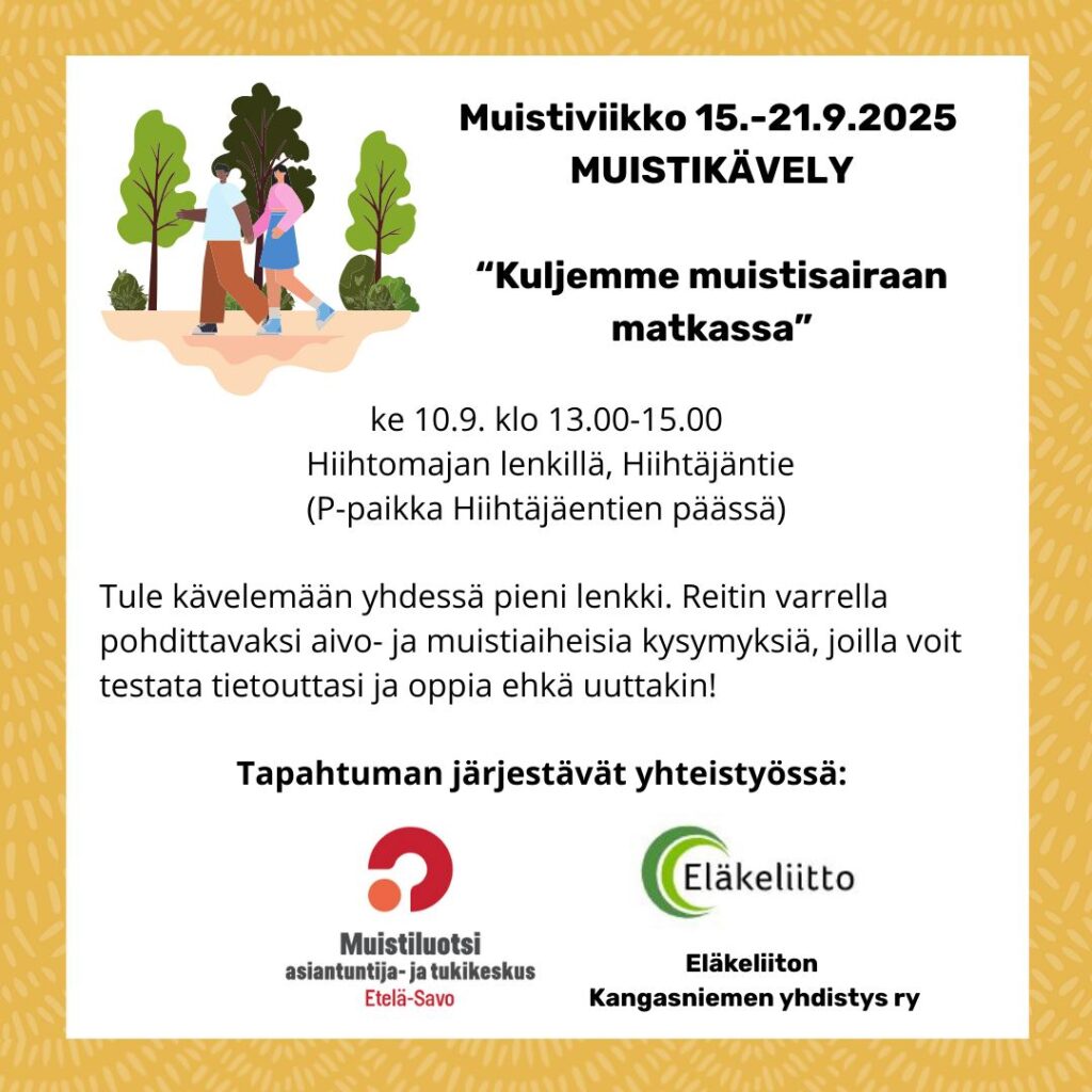 Viikolla 38 (15.-21.9.) vietämme valtakunnallista Muistiviikkoa teemalla ”Kuljemme muistisairaan matkassa”. Polkaisemme viikon käyntiin jo edellisellä viikolla Kangasniemellä ja järjestämme kaikille avoimen Muistikävelyn. Tervetuloa! ![]()