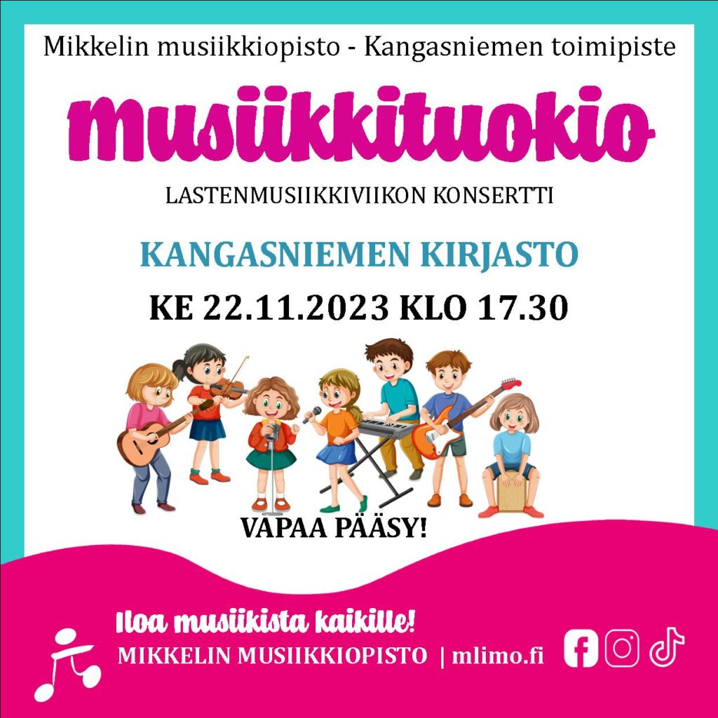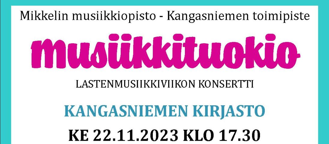 Mikkelin musiikkiopiston Kangasniemen toimipisteen oppilaat esiintyvät lastenmusiikkiviikon konsertissa Kangasniemen kirjastossa ke 22.11. klo 17.30.