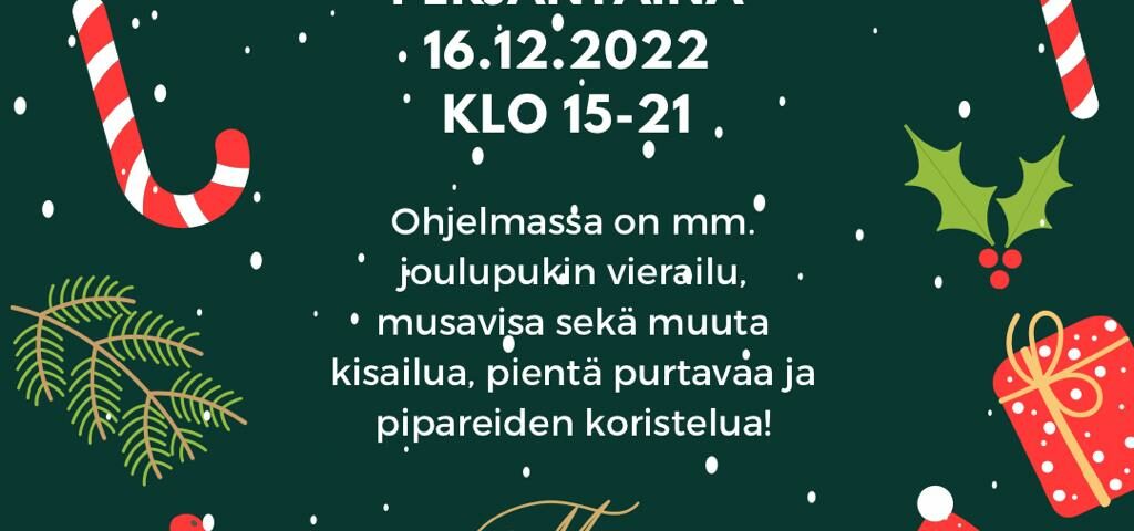 đ đ»Tervetuloa juhlimaan pikkujouluja nuorisotila Ottikseen perjantaina 16.12.2022 đ€¶đŒOhjelmassa on mm. joulupukin vierailu, musavisa sekĂ€ muuta kisailua, pientĂ€ purtavaa ja pipareiden koristelua. â5-6lk klo 15-17 â7lk -> klo 15-21 đČ