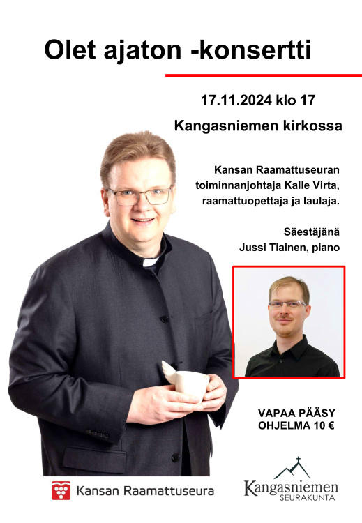 Konsertti on osa Kansan Raamattuseuran kirkkopyhää, konserttiin on vapaa pääsy, käsiohjelma 10€.
